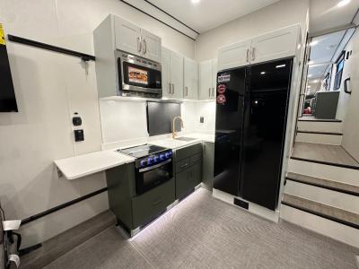 Sleeps 2 Slides 1 Length 41 ft 3 in Ext Width 8 ft 6 in Ext Height 13 ft 5 in Exterior Color White, Silver Frost, Pewter, Charcoal, Black Hitch Weight 4350 lbs GVWR 21000 lbs Dry Weight 13770 lbs Cargo Capacity 7230 lbs Fresh Water Capacity 100 gals Grey Water Capacity 90 gals Black Water Capacity 45 gals Tire Size 235/80R16G Furnace BTU 35000 btu Available Beds Queen Refrigerator Type 12V Refrigerator Size 15 cu ft Convection Cooking Yes Cooktop Burners 3 Shower Size 30" x 48" Number of Awnings 1 Axle Weight 6000 lbs Garage Size 20 ft 6 in LP Tank Capacity 30 lbs Water Heater Capacity 10 gal Water Heater Type LP Gas/Electric AC BTU 45000 btu TV Info LR 50" Smart TV Awning Info 25' Electric w/Light Strip Axle Count 3 Number of LP Tanks 2 Shower Type Standard Similar Toy Hauler Fifth Wheel Floorplans